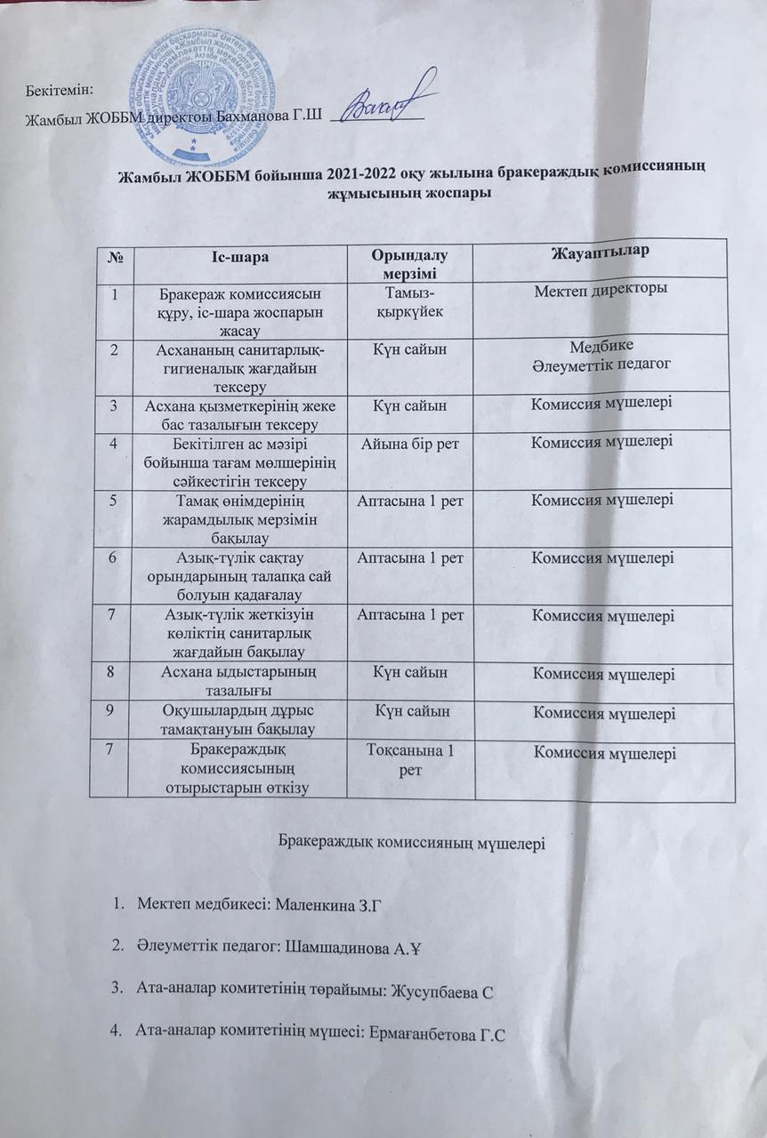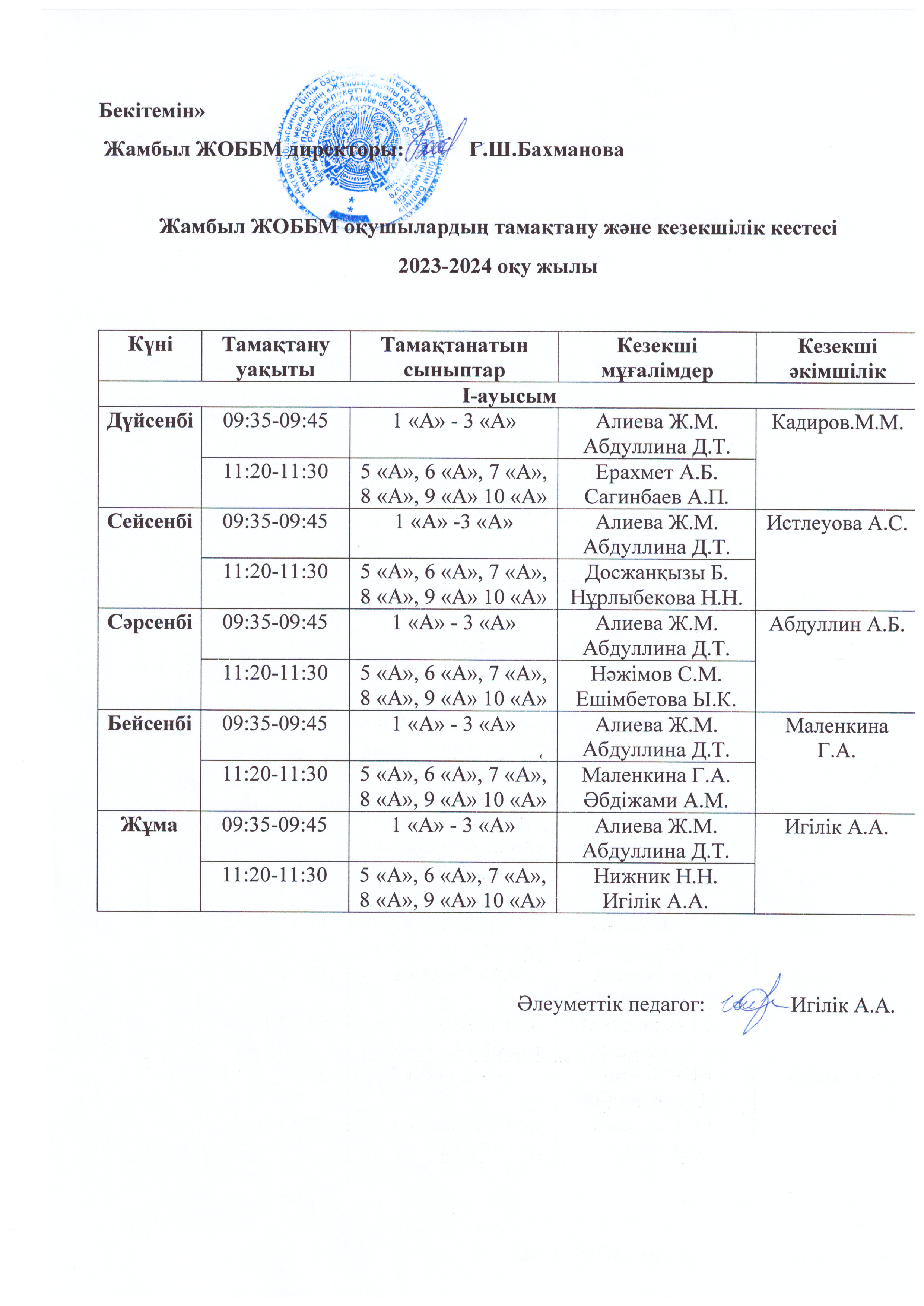 Жамбыл ЖОББМ оқушылардың тамақтану және кезекшілік кестесі 2021-2022 оқу жылы (І тоқсан) |